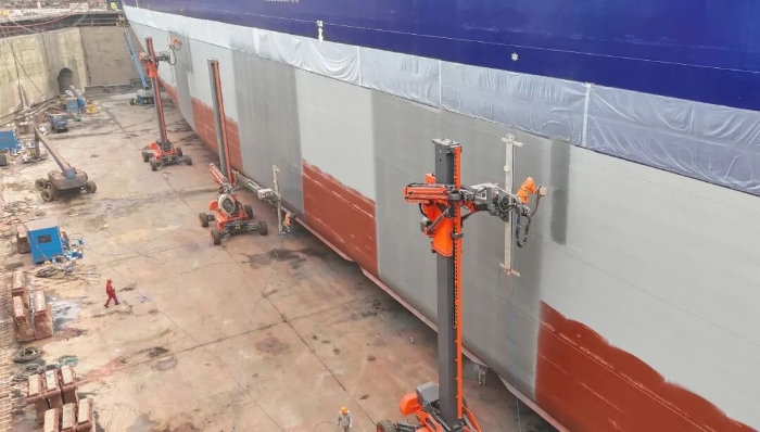 傳統(tǒng)的船體除銹、噴涂作業(yè),長期依賴人工,效率低、成本高、品質(zhì)差,還面臨嚴(yán)重的安全與環(huán)保問題。鼎力創(chuàng)新性地將高空作業(yè)平臺與機器人技術(shù)深度融合,打造了一套集成化的智能作業(yè)系統(tǒng),真正實現(xiàn)均勻、高效的除銹與噴涂作業(yè),徹底解決了行業(yè)痛點,為全球船舶修造業(yè)樹立了智能化轉(zhuǎn)型的標(biāo)桿。